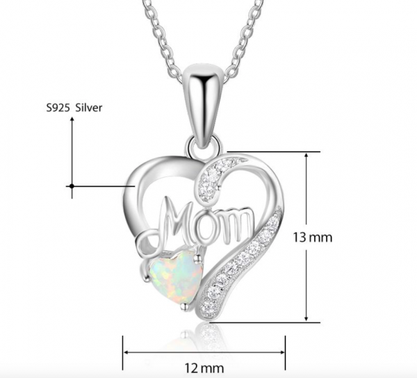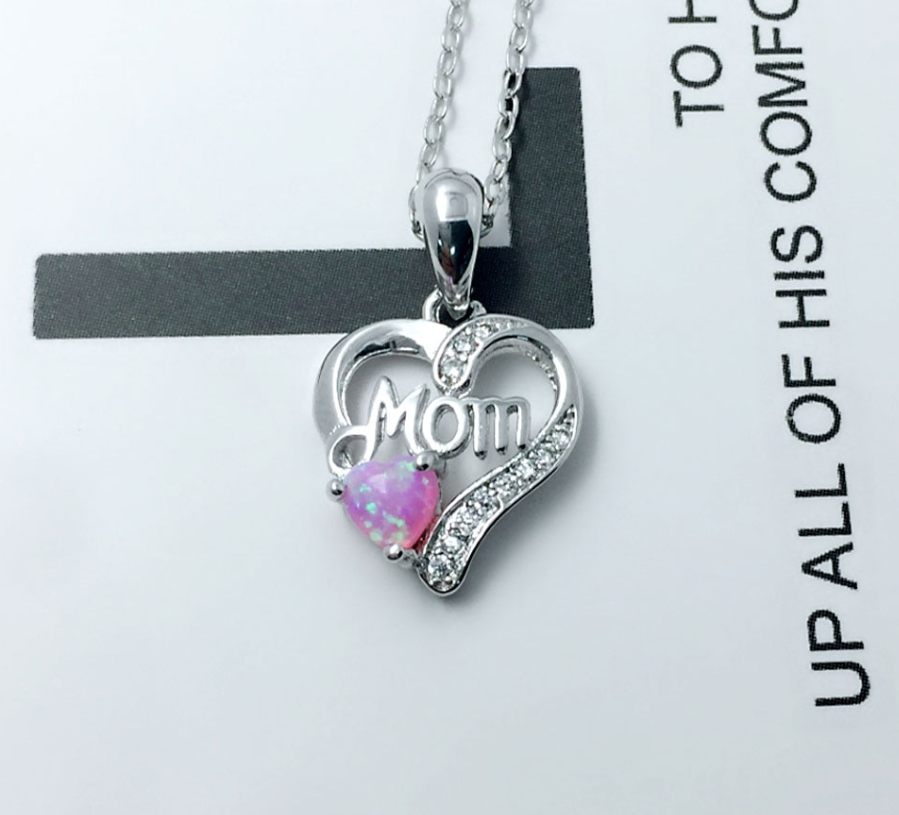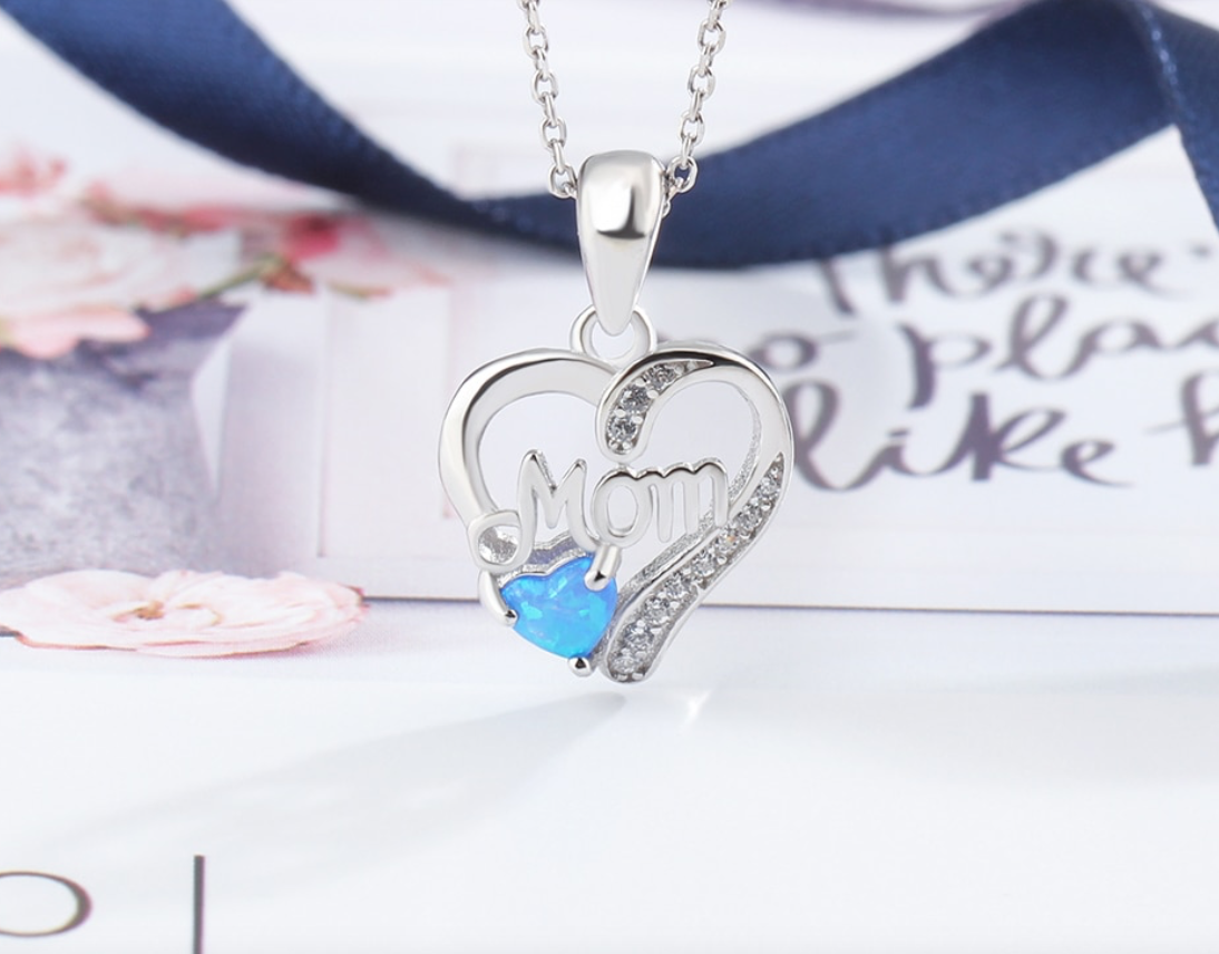 COLLANA CON CIONDOLO IN ARGENTO STERLING 925 SCRITTA MOM IMPREZIOSITA CON CRISTALLI E UNA GEMMA DI OPALE DI DIVERSI COLORI: BIANCA, BLU O ROSA.